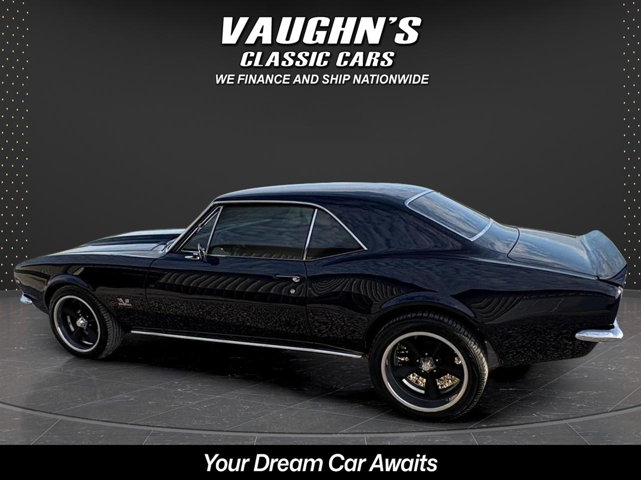 WOW! Take a look at this awesome 1967 Camaro custom with strong 454 engine and 4 speed manual, 10 bolt rearend with 4:11 gears and rear traction bar system, frame connectors, sweet sounding custom exhaust system with headers, power front disk brakes, power steering, tilt wheel column, chromed out engine bay with billet hood hinged, cowl induction hood, electric hideaway headlights, staggard custom wheel package, Dakota Digital analog gauges, custom stitched interior with suede seats and headliner, custom sound system with sub in the trunk, custom carpeted trunk and sound deadener throughout the car. This Camaro has a super solid and straight body with amazing custom midnight blue pearl paint {changes from blue to black} with ghosted black stripes with high metallic in them, custom molded in rear spoiler, all new trim, chrome and glass with tinting throughout. This is an amazing build with tons of money and time spent. Don't let this one get away! Financing and shipping offered. Give us a call at 618 336 5210 to discuss a deal!