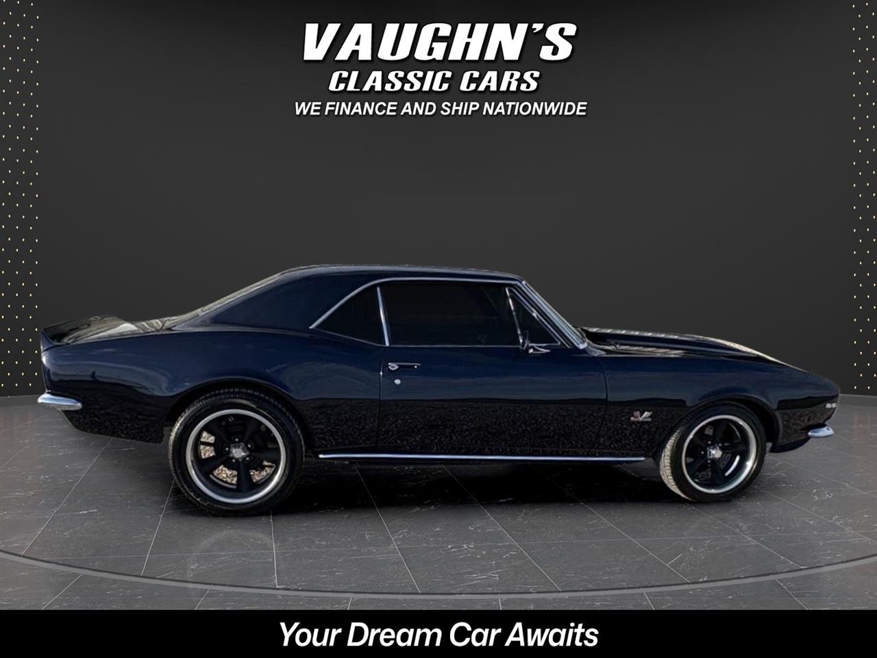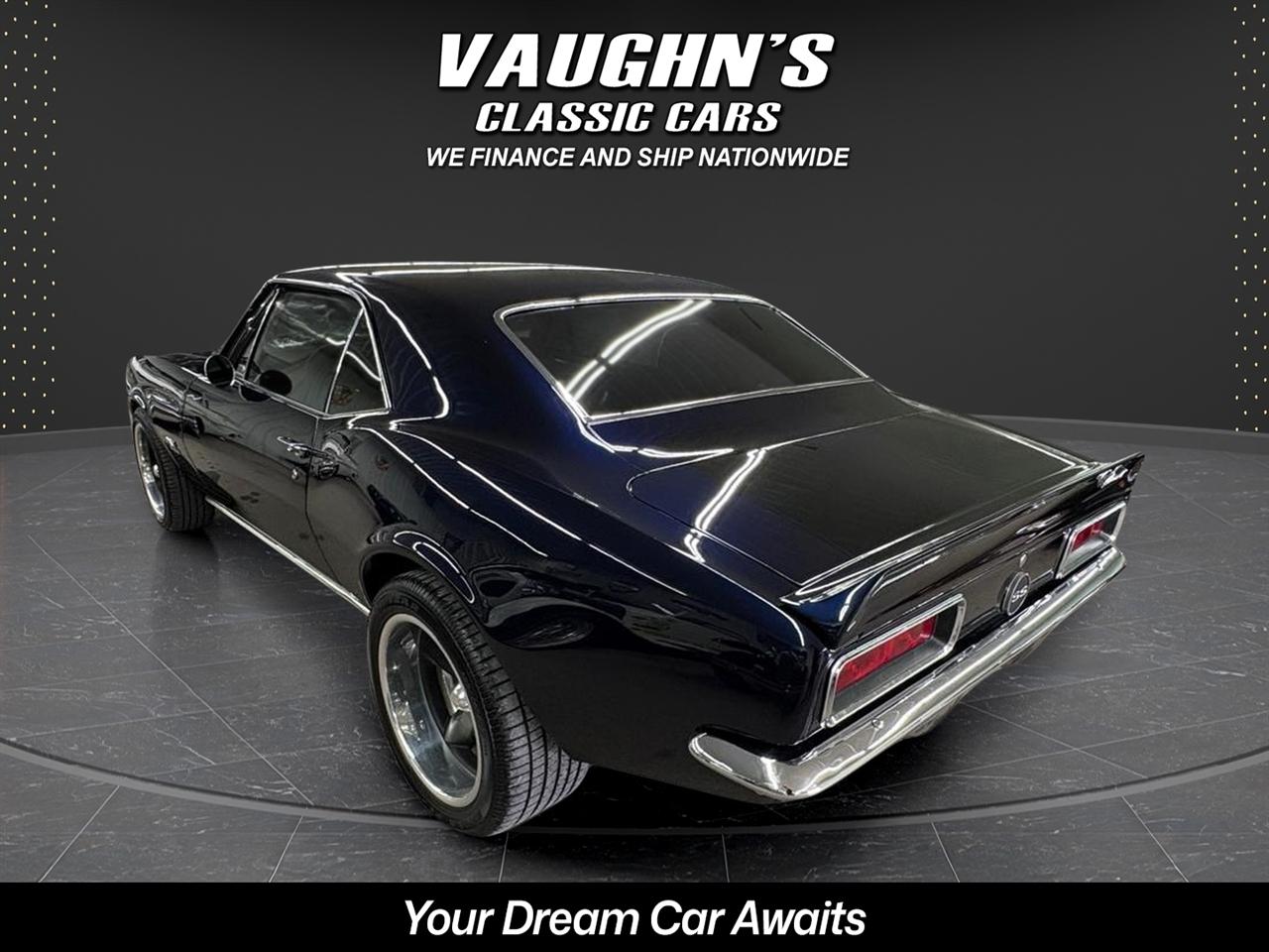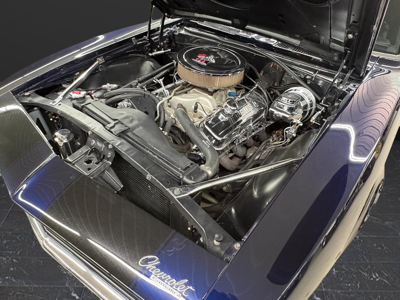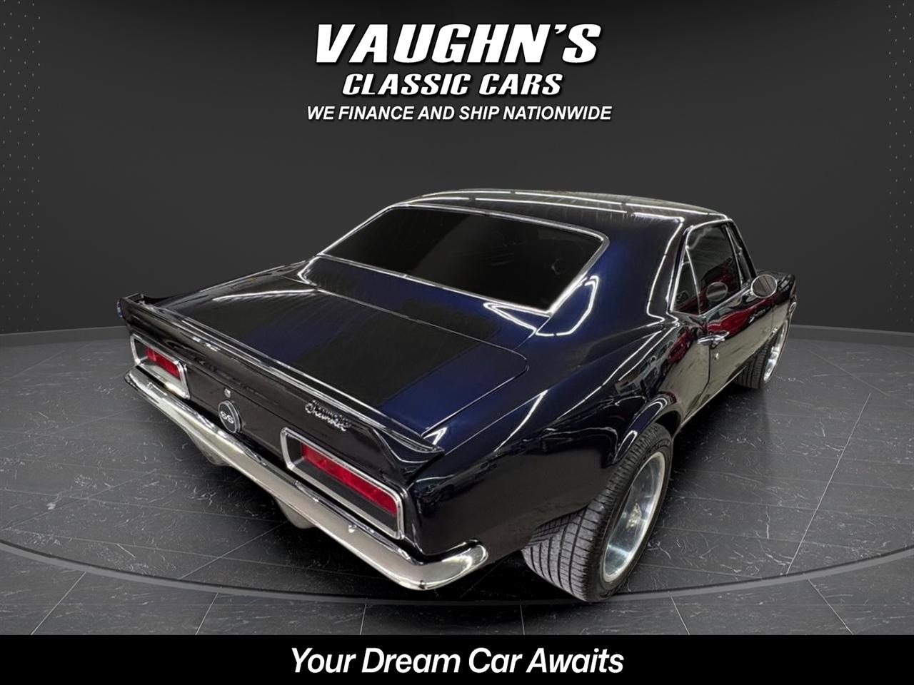 WOW! Take a look at this awesome 1967 Camaro custom with strong 454 engine and 4 speed manual, 10 bolt rearend with 4:11 gears and rear traction bar system, frame connectors, sweet sounding custom exhaust system with headers, power front disk brakes, power steering, tilt wheel column, chromed out engine bay with billet hood hinged, cowl induction hood, electric hideaway headlights, staggard custom wheel package, Dakota Digital analog gauges, custom stitched interior with suede seats and headliner, custom sound system with sub in the trunk, custom carpeted trunk and sound deadener throughout the car. This Camaro has a super solid and straight body with amazing custom midnight blue pearl paint {changes from blue to black} with ghosted black stripes with high metallic in them, custom molded in rear spoiler, all new trim, chrome and glass with tinting throughout. This is an amazing build with tons of money and time spent. Don't let this one get away! Financing and shipping offered. Give us a call at 618 336 5210 to discuss a deal!