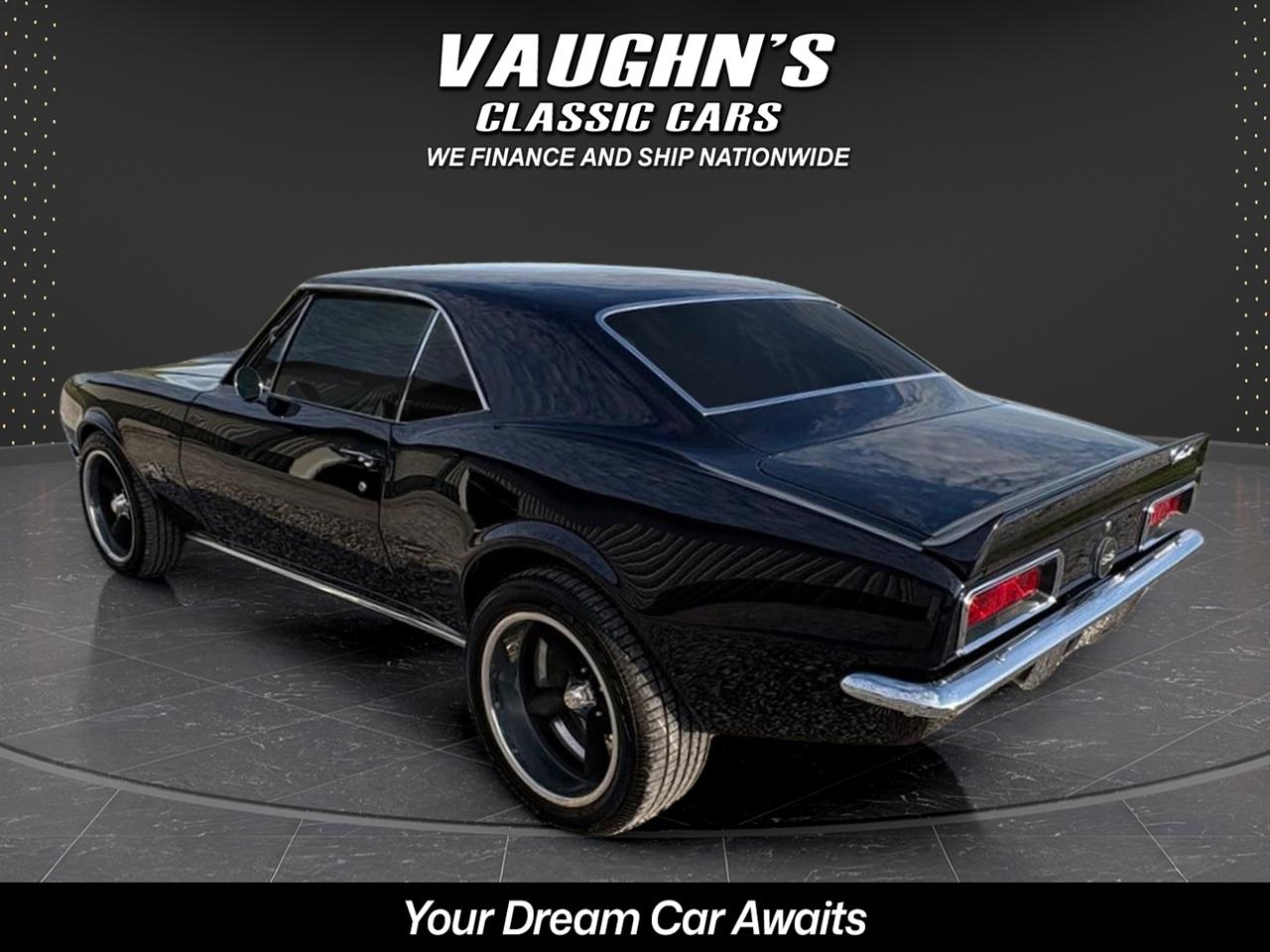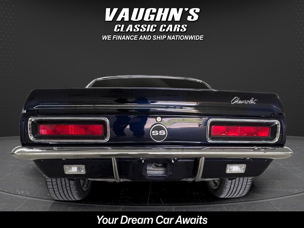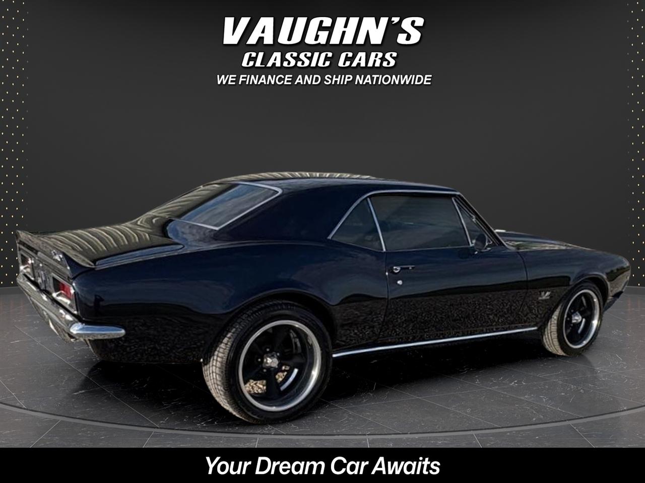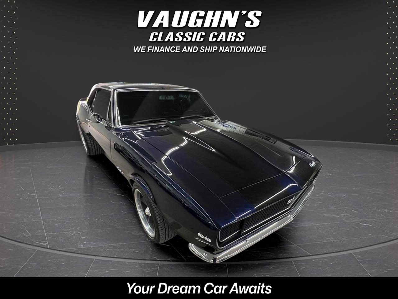 WOW! Take a look at this awesome 1967 Camaro custom with strong 454 engine and 4 speed manual, 10 bolt rearend with 4:11 gears and rear traction bar system, frame connectors, sweet sounding custom exhaust system with headers, power front disk brakes, power steering, tilt wheel column, chromed out engine bay with billet hood hinged, cowl induction hood, electric hideaway headlights, staggard custom wheel package, Dakota Digital analog gauges, custom stitched interior with suede seats and headliner, custom sound system with sub in the trunk, custom carpeted trunk and sound deadener throughout the car. This Camaro has a super solid and straight body with amazing custom midnight blue pearl paint {changes from blue to black} with ghosted black stripes with high metallic in them, custom molded in rear spoiler, all new trim, chrome and glass with tinting throughout. This is an amazing build with tons of money and time spent. Don't let this one get away! Financing and shipping offered. Give us a call at 618 336 5210 to discuss a deal!